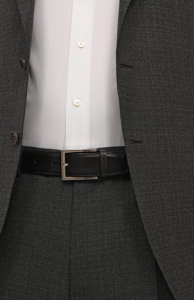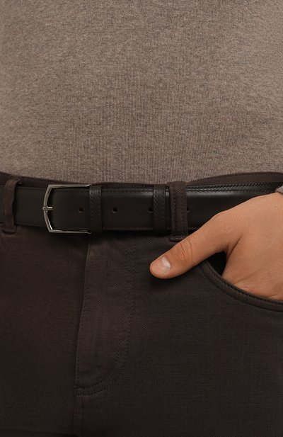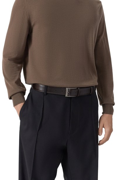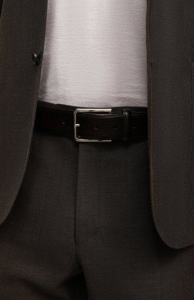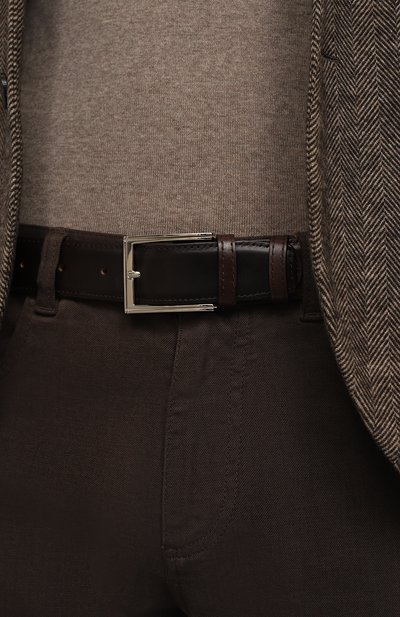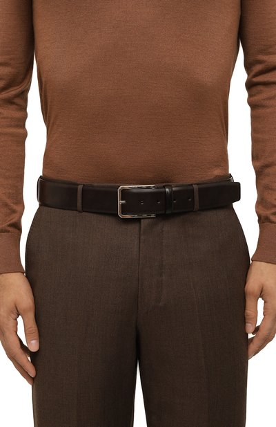 Ремень с тренчиком и прямоугольной пряжкой выполнили из патинированной кожи. Внутреннюю сторону фирменного оранжевого оттенка поддержали стежком на креплении с тисненым логотипом.