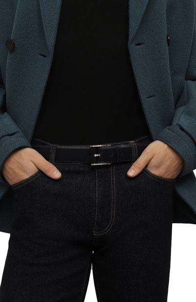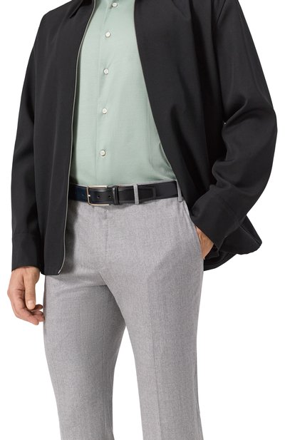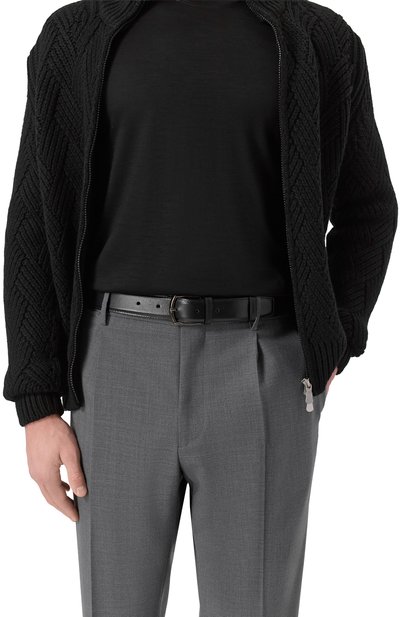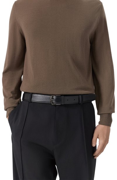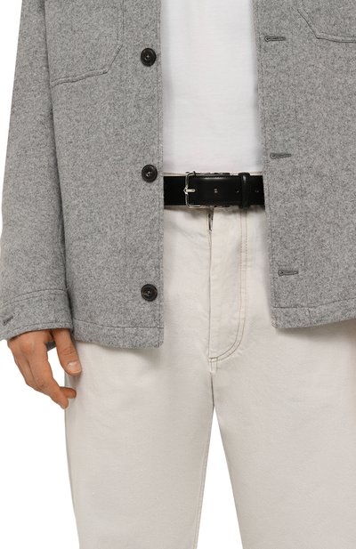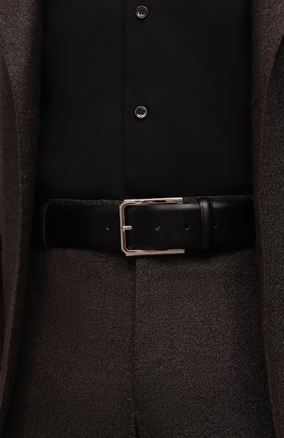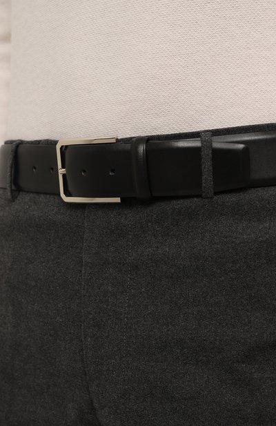 Ремень средней ширины изготовили из гладкой кожи. Рядом со шлевкой модель украсили тисненым логотипом бренда и стежком фирменного оранжевого оттенка Arancio Santoni.