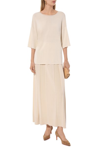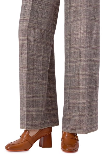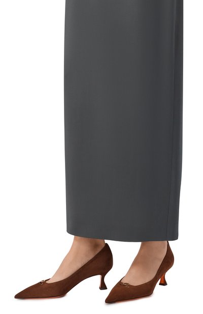 Туфли-лодочки из патинированной замши дополнили перемычкой на союзке. Зауженный мыс подчеркнули рельефным швом, а задник – накладкой и стежком фирменного оранжевого оттенка Arancio Santoni. Внутри пары на устойчивом каблуке предусмотрели метку NFC.