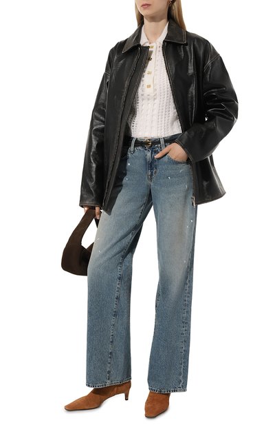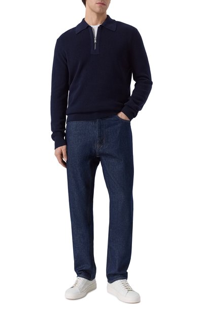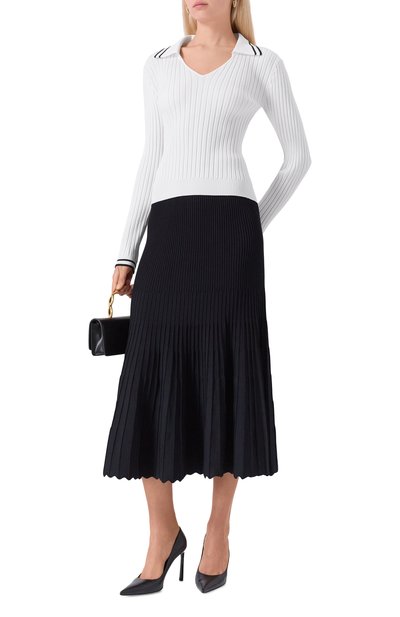 Рифленое поло Sharro выполнили из вискозного крепового трикотажа, усиленного нейлоном. Контрастный оттенок расклешенных манжет поддержали воротником и кантом на горловине, застегивающейся крючками с пряжками-логотипом.
