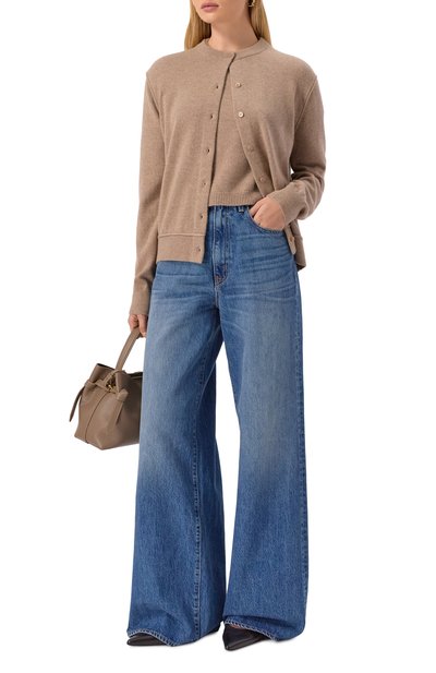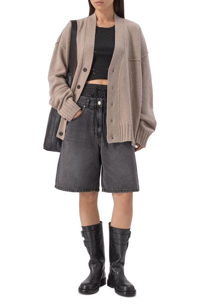 Для пошива кардигана свободного кроя использовали шерстяной трикотаж. Изделие с воротником, манжетами и поясом в рубчик застегивается брендированными пуговицами.