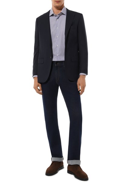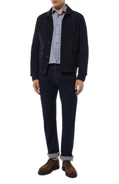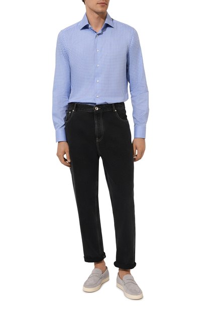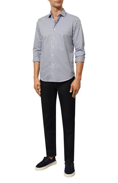 Приталенную рубашку Hank в клетку сшили из эластичного поплина. Модель с закругленным низом и воротником кент застегивается перламутровыми пуговицами.