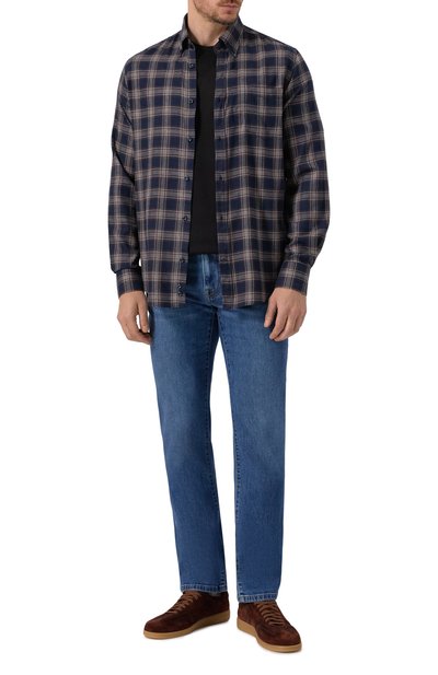 Рубашку со слегка спущенной линией плеч, прямоугольными манжетами и фигурным низом выполнили из эластичной фланели на основе вискозы. Модель с клетчатым узором застегивается перламутровыми пуговицами.