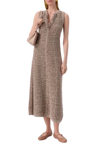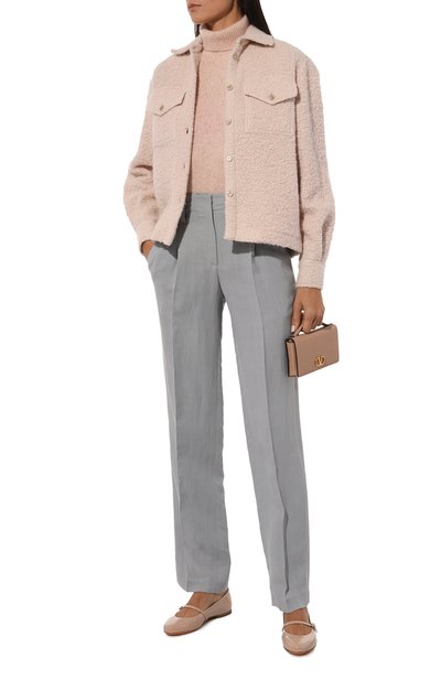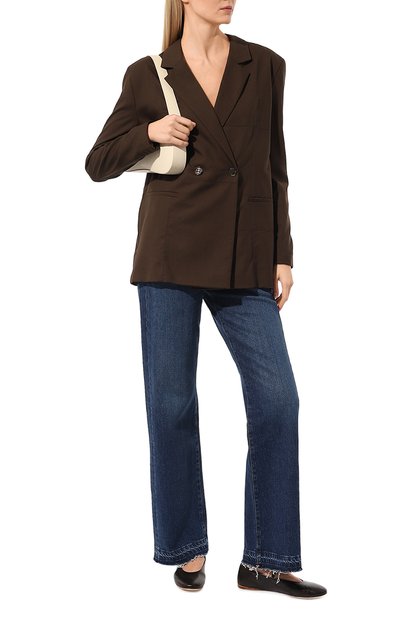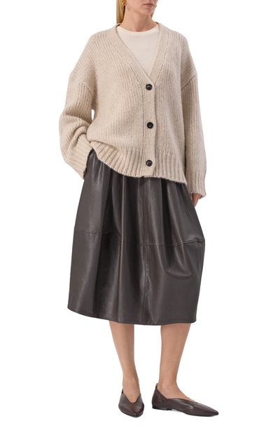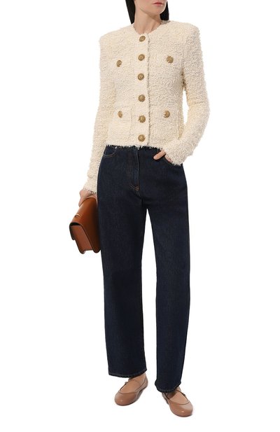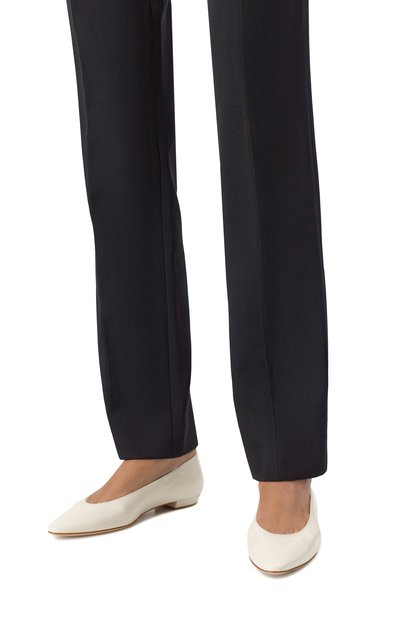Балетки с зауженным мысом выполнили из гладкой телячьей кожи. Модель с эластичной вставкой и петлей на заднике поставили на тонкую подошву с небольшим каблуком.