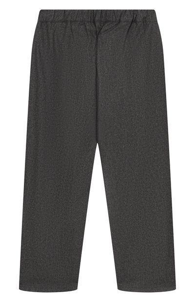 Прямые брюки с защипами выполнили из меланжевого хлопка с небольшим добавлением эластана. Модель дополнили парой боковых и двумя задними карманами.