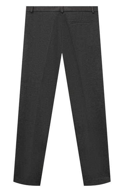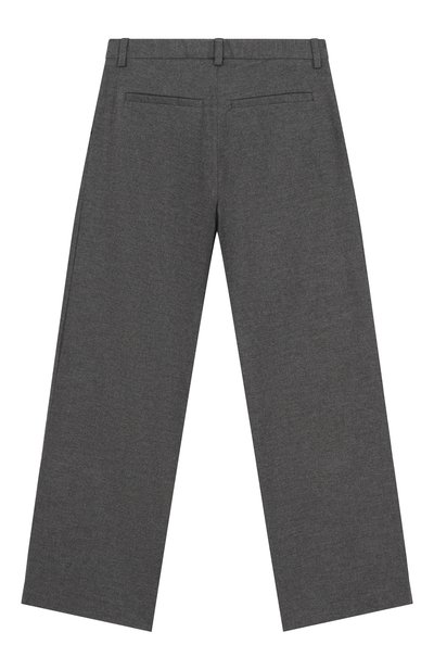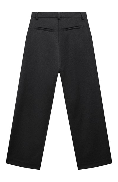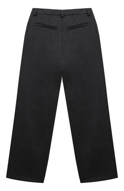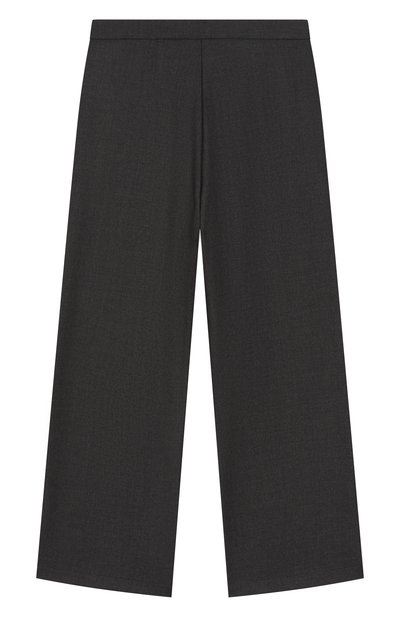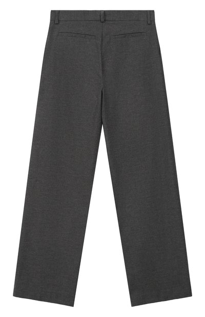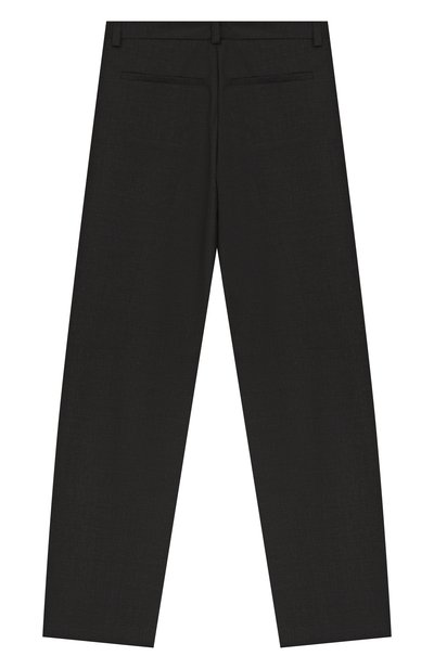 Брюки с парными глубокими складками спереди выполнили из шерстяной ткани. Модель на атласном подкладе дополнили четырьмя карманами.