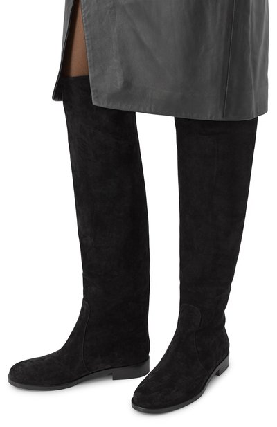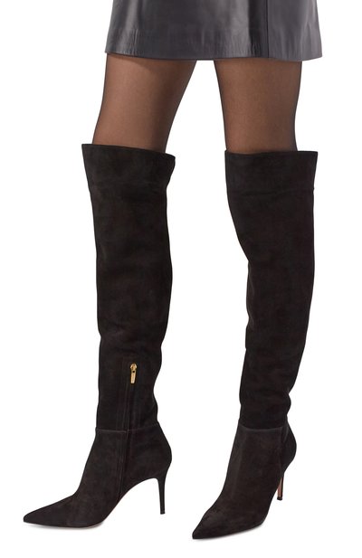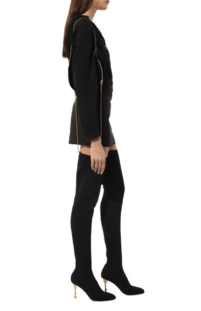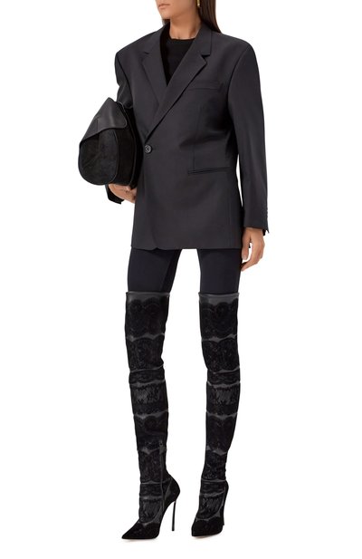 Ботфорты Lingerie Blade 120 из полимерного материала, напоминающего мягкую кожу, украсили кружевными вставками в тон. Модель с зауженным мысом и фирменным стальным каблуком застегивается короткой молнией сбоку.