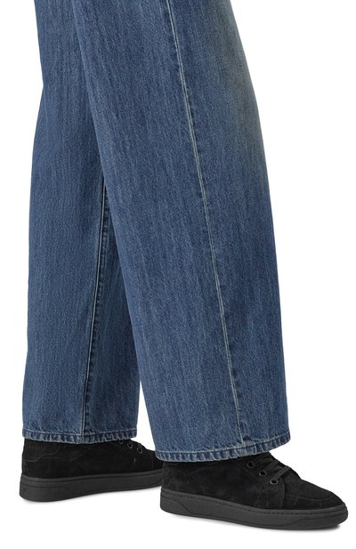 Кеды с перфорацией на мысе выполнили из замши, установив изделие на узкую контрастную подошву. Задник модели с внутренней отделкой из экомеха украсили вставкой с логотипом марки в тон.