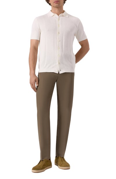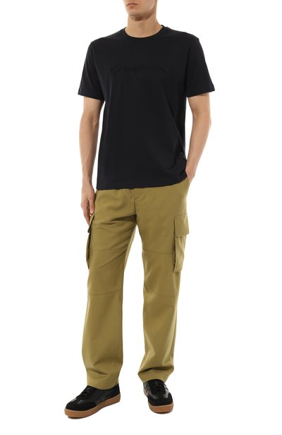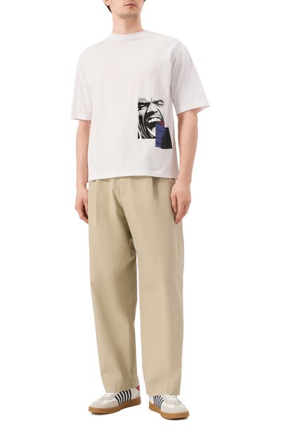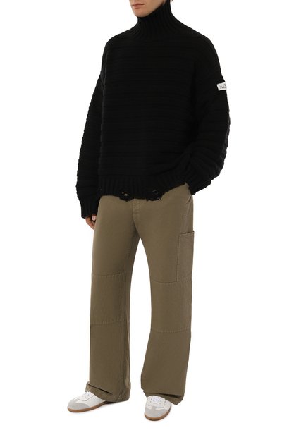 Широкие брюки выполнили из хлопкового твила. Модель с регулируемыми кулисками на низе дополнили тремя парами карманов с клапанами.