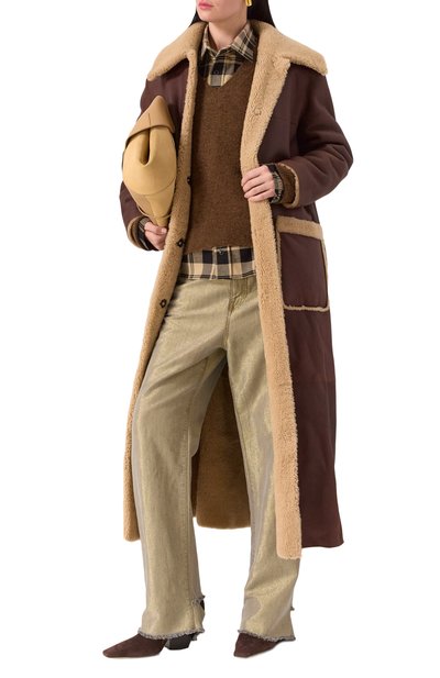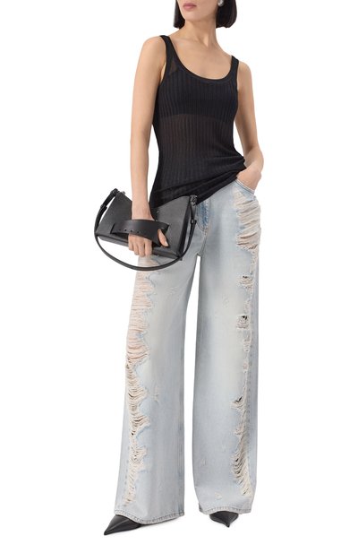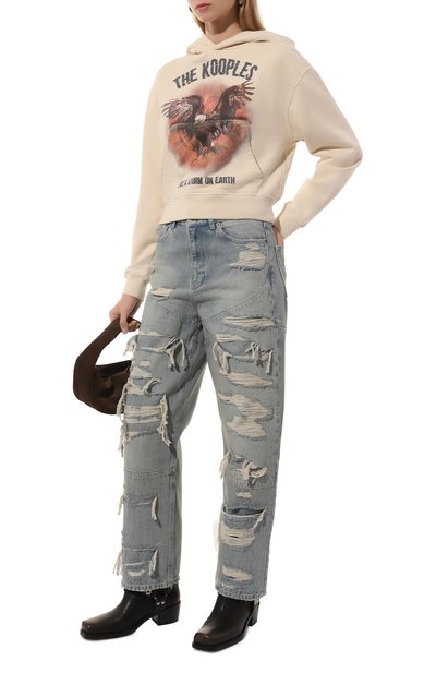 Немного расклешенные джинсы с тигриным принтом выполнили из стрейчевого денима. Модель с пятью карманами декорировали брендированным патчем на поясе сзади.