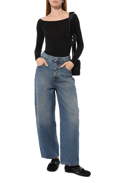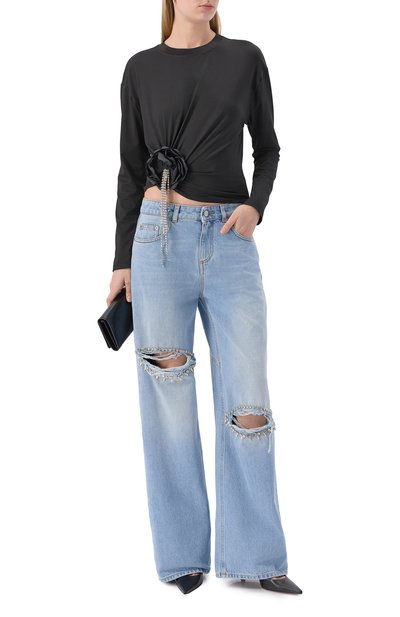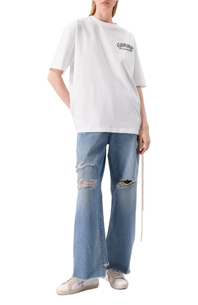 Прямые джинсы с брендированной лентой на одном из пяти карманов выполнили из выбеленного хлопкового денима с декоративными потертостями. Спереди модель украсили нашивками разной формы.