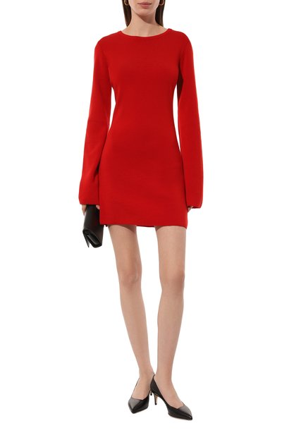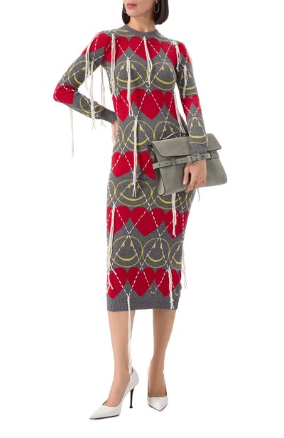 Платье свободного кроя связали из мягкой шерстяной пряжи. Модель с широкими полосками, в которых чередуются цветочный и анималистичный мотивы, декорировали крупным логотипом спереди.