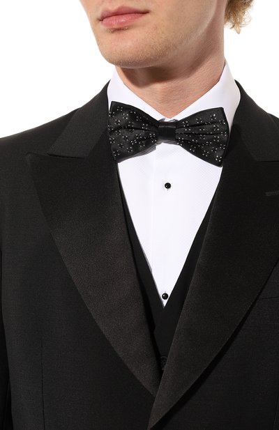 Галстук-бабочка, усыпанный стразами, станет эффектным штрихом в образе с вечерним костюмом или смокингом. Аксессуар из чистого шелка дополнен лентой с крючком.