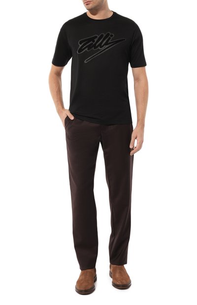 Брюки с эластичной вставкой на поясе-кулиске сзади выполнили из меланжевой стрейчевой шерсти. Рядом с одним из шести карманов модели, представленной эксклюзивно в ЦУМе, разместили эмблему Royal Eagle.