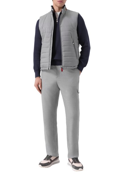 Брюки с эластичной вставкой на поясе-кулиске сзади выполнили из меланжевой стрейчевой шерсти. Рядом с одним из шести карманов модели, представленной эксклюзивно в ЦУМе, разместили эмблему Royal Eagle.
