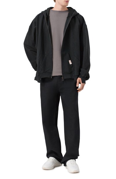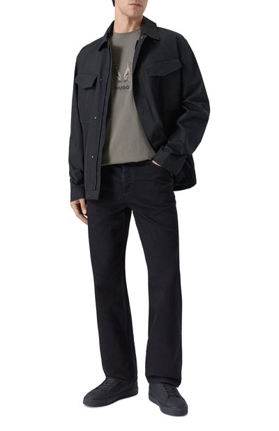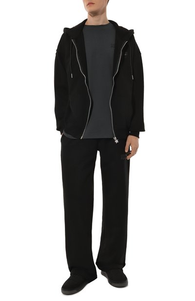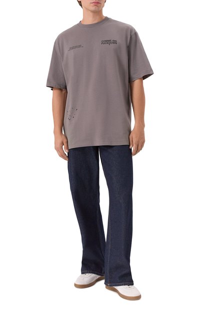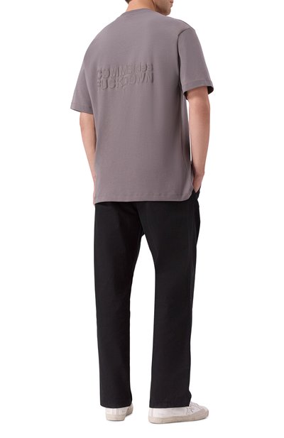 Для изготовления футболки прямого кроя использовали хлопковое джерси. Модель с круглым вырезом в рубчик украсили логотипом спереди и брендированной этикеткой сбоку.