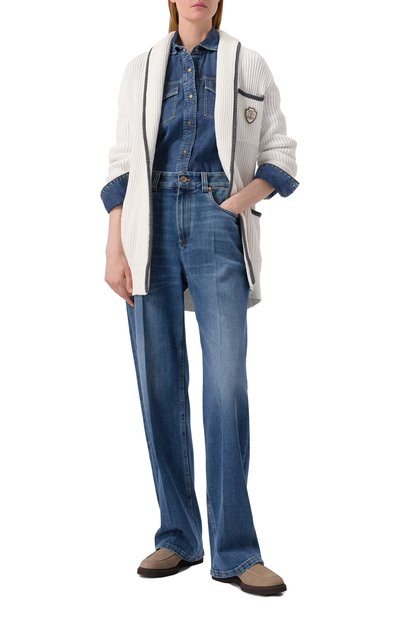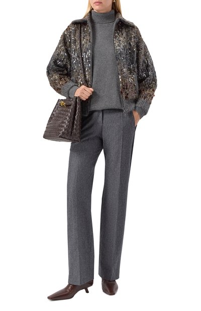 Кардиган с короткими разрезами по бокам и широким кантом вдоль V-образного выреза выполнили из кашемирового трикотажа, усиленного шелком. Модель с запахом дополнили поясом-лентой из такого же материала.