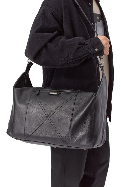 Сумку с двумя ручками и съемным регулируемым ремнем выполнили из телячьей кожи с тисненым паттерном в виде тотемного орла. Аксессуар дополнили накладными карманами по бокам и с молнией внутри.