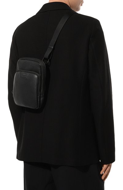 Сумку с брендированным плечевым ремнем сшили из зернистой кожи с паттерном из тисненых эмблем марки. Аксессуар с внешним и внутренним карманами украсили спереди металлическим тотемным орлом.