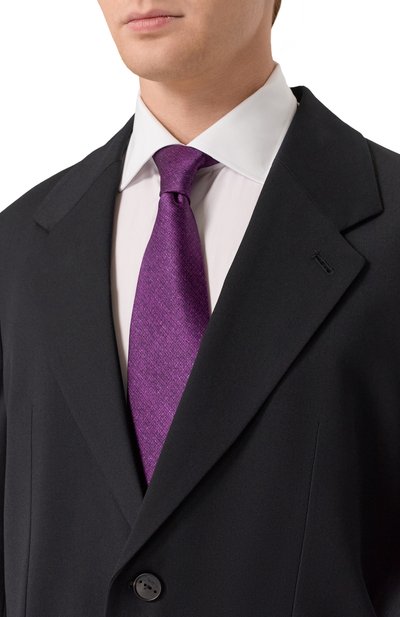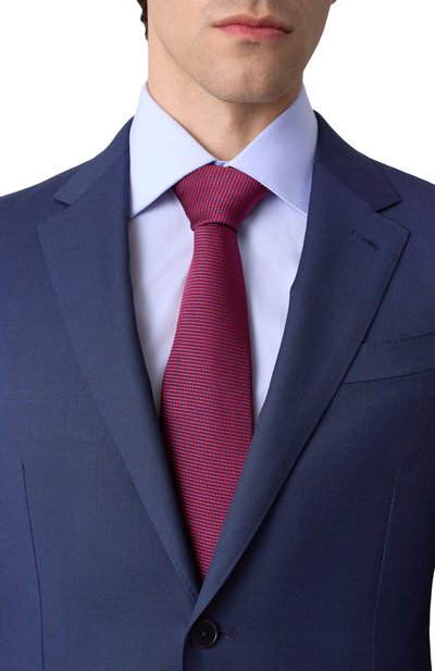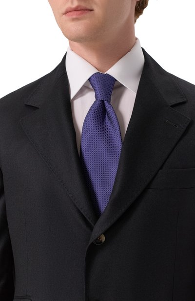 Галстук сшили из жаккардового шелка в диагональную полоску с добавлением хлопка. Аксессуар легко драпируется, а его длина позволяет завязать узел любой сложности.