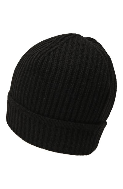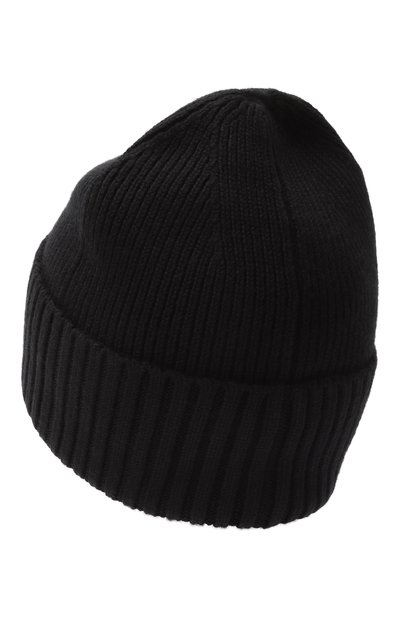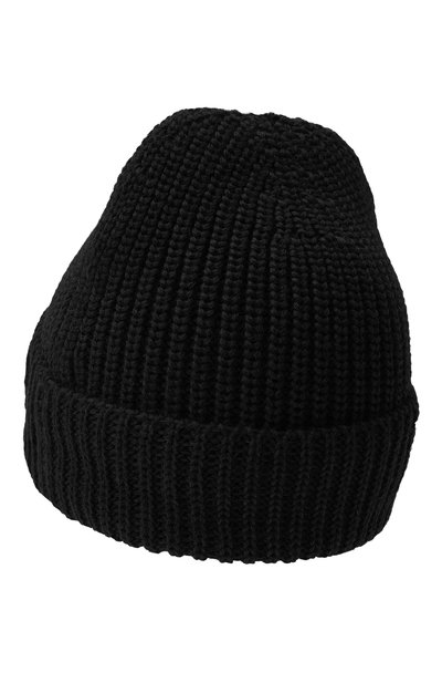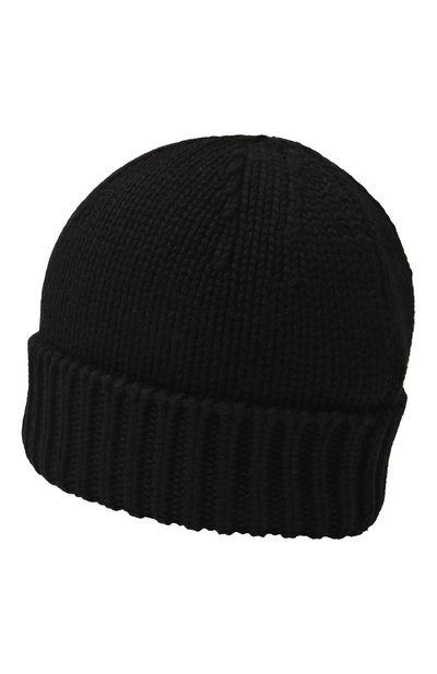 Шапку бини с рельефными узорами выполнили из шерстяной пряжи с добавлением кашемира. Широкий отворот аксессуара украсили небольшим брендированным патчем.