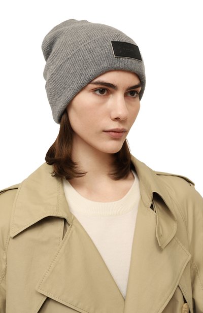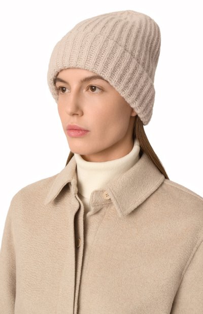 Шапку-бини в рубчик выполнили из кашемировой пряжи. Широкий отворот украсили контрастной нашивкой Neve и вышитым логотипом марки.