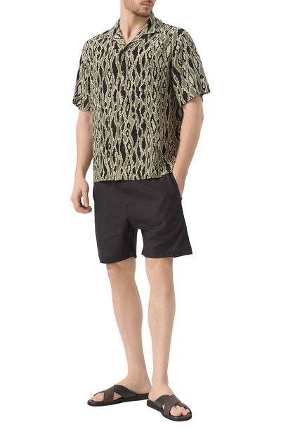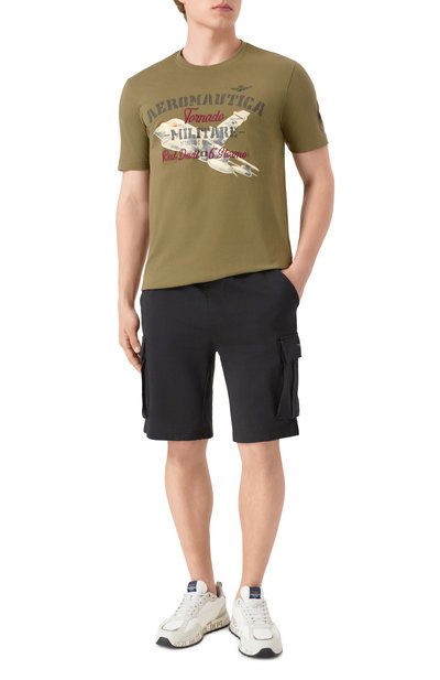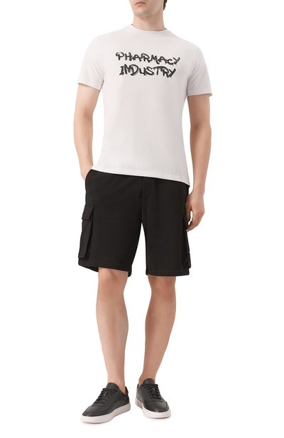 Шорты с эластичным поясом-кулиской и двумя боковыми карманами выполнили из трикотажа на основе хлопка и полиэстера. Модель дополнили брендированными лампасами в тон.