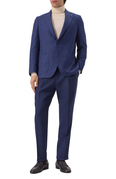 Пиджак с двумя накладными карманами по бокам и нагрудной листочкой выполнили из микса шерсти, нейлона и фибры с микроузором. О принадлежности однобортной модели бренду рассказали фирменной фурнитурой в петлице левого лацкана.