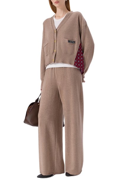 Кардиган с отложным воротником связали из кашемировой пряжи, подчеркнув эластичные манжеты контрастной полосой. Модель, как и накладные нагрудные карманы, застегивается брендированными пуговицами.