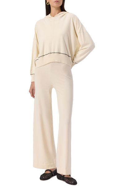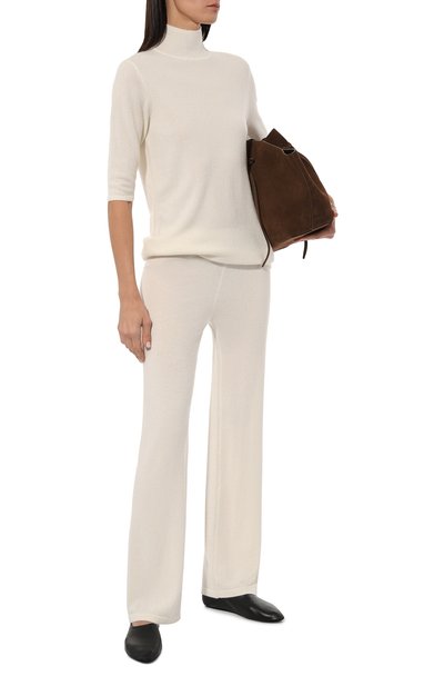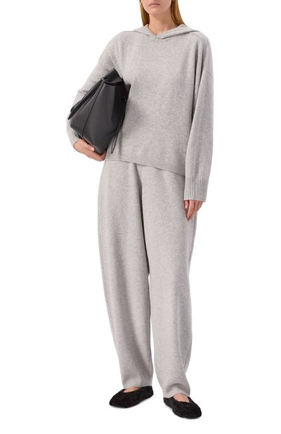 Для изготовления свободных брюк с эластичным поясом использовали кашемировый трикотаж. Модель сможет стать основой непринужденного повседневного образа с парным кардиганом.