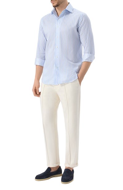 Полосатая сорочка с воротником «акула» и закругленными манжетами подойдет для нестрогих офисных образов. Для изготовления модели кроя Slim fit использовали гладкий твил из чистого хлопка.