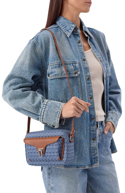 Сумка C-Me сшита из комбинации зернистой кожи и денима. Аксессуар с четырьмя отделениями и карманом на молнии дополнен съемным плечевым ремнем. Фигурный клапан с магнитной кнопкой украшен фирменной золотистой пряжкой.