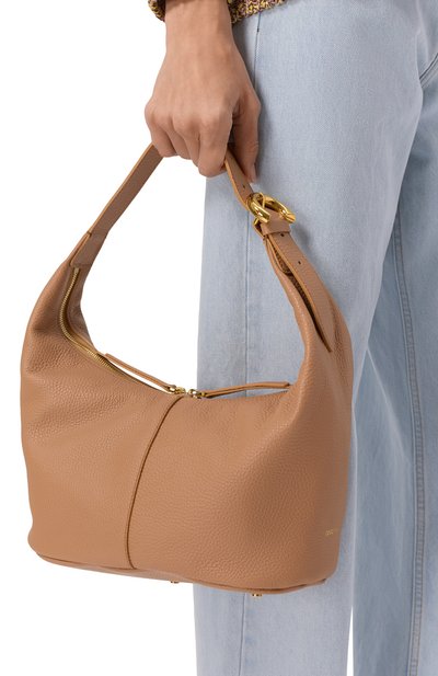 Сумку C-Easy с двумя внутренними карманами сшили из зернистой кожи. Аксессуар на молнии дополнили длинной ручкой с золотистой пряжкой в виде эмблемы C-Me.