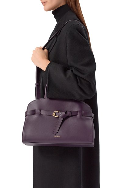 Сумку Sabine с двумя короткими ручками и съемным регулируемым ремнем выполнили из гладкой кожи. Аксессуар с двумя отделениями и парой внутренних карманов на молнии украсили декоративным ремешком с фирменной пряжкой С-Me.