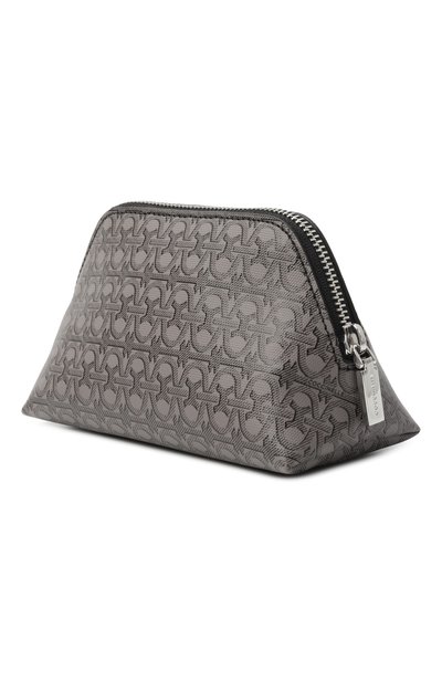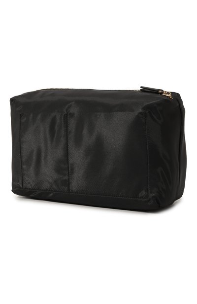 Косметичку выполнили из канваса с паттерном из фирменной монограммы. Аксессуар трапециевидной формы застегивается молнией с брендированным пуллером.