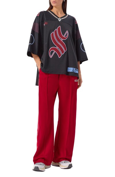 Свободные брюки Pupa со стрелками и двумя карманами сшиты из полиэстера. По бокам модель с широким эластичным поясом и контрастными лампасами дополнена разрезами на кнопках.