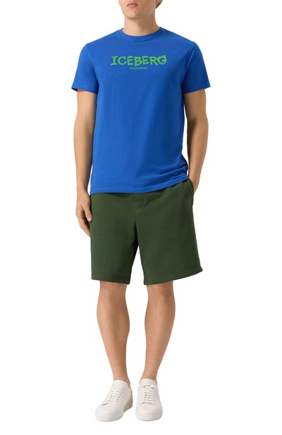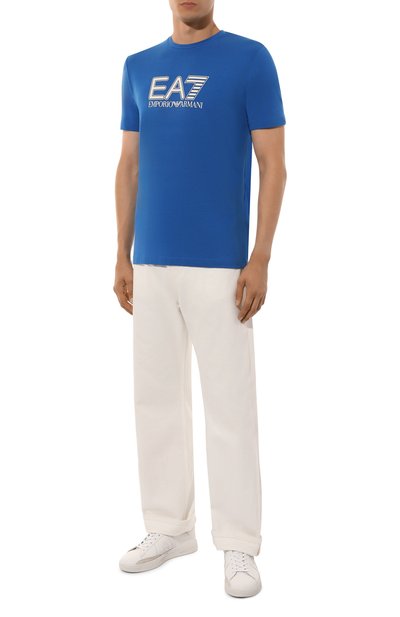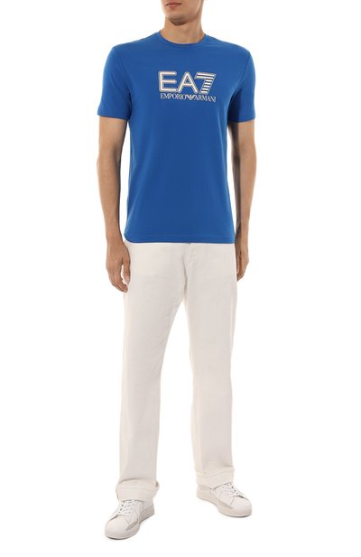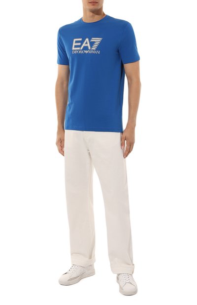 Футболка кроя Slim fit выполнена из хлопкового джерси. Спереди эластичная модель с круглым вырезом украшена крупным принтом с логотипом бренда.