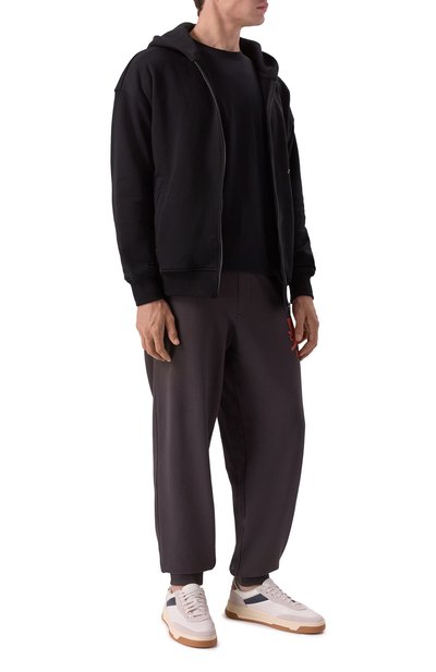 Футболку с круглой горловиной выполнили из хлопкового джерси. Принадлежность модели бренду обозначили вертикальным логотипом слева.