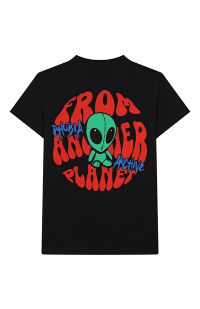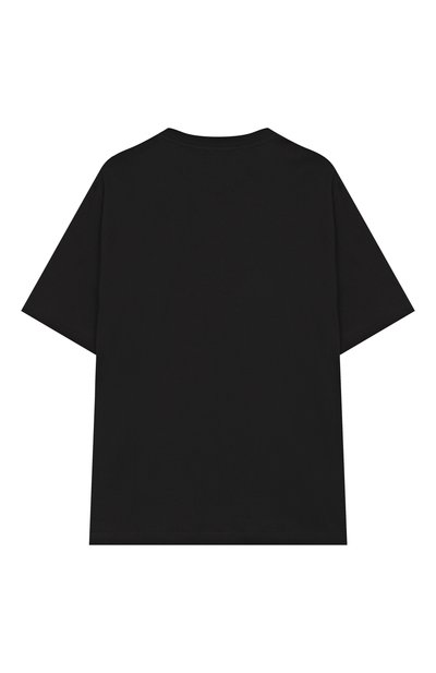 Для пошива футболки прямого кроя использовали хлопковый трикотаж. Модель с круглым вырезом украсили с двух сторон фактурными контрастными логотипами марки.