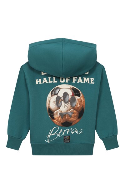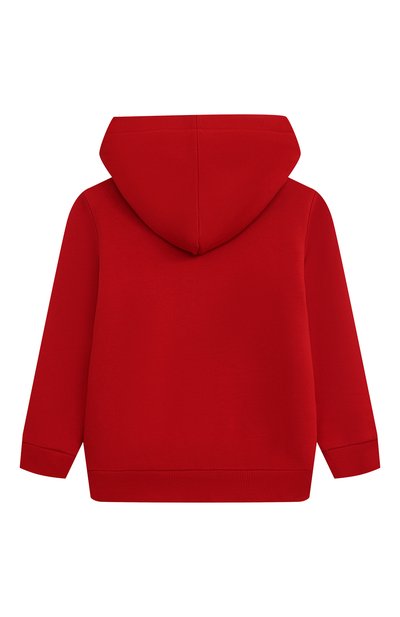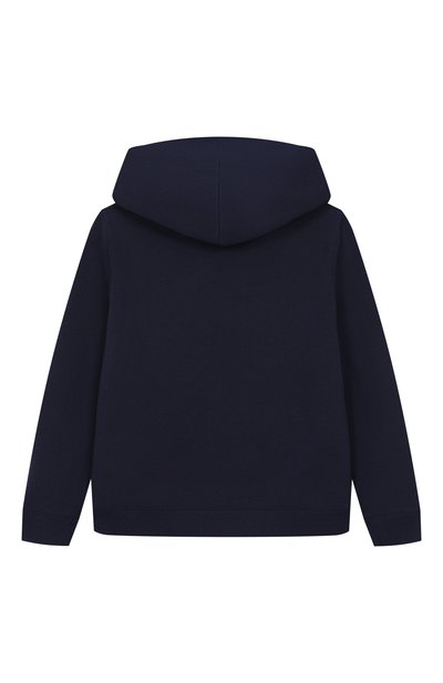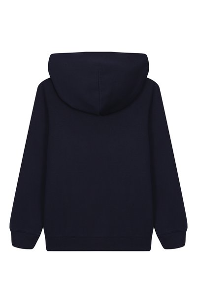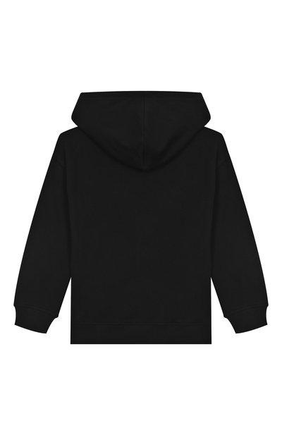 Для изготовления худи с карманом «кенгуру» использовали хлопковый трикотаж. Принадлежность модели бренду обозначили контрастным логотипом спереди и его крупной версией на спинке.