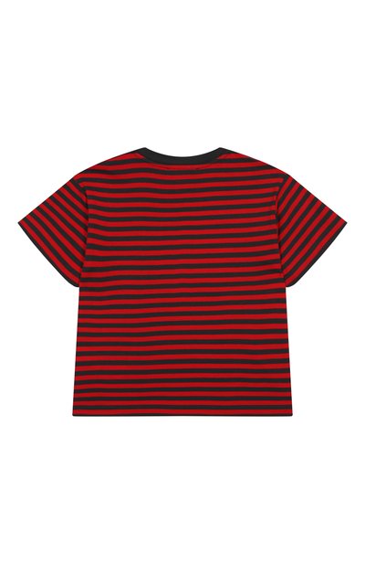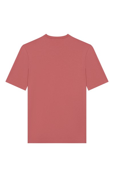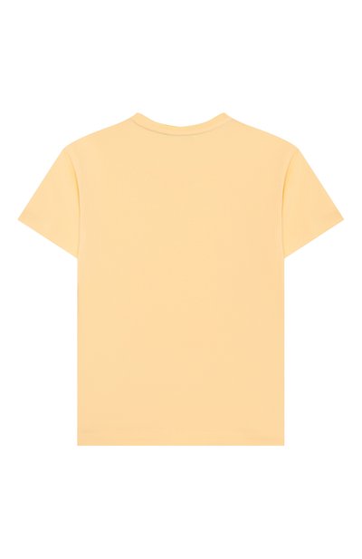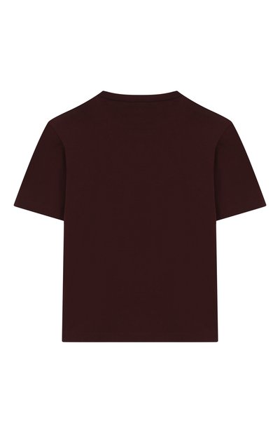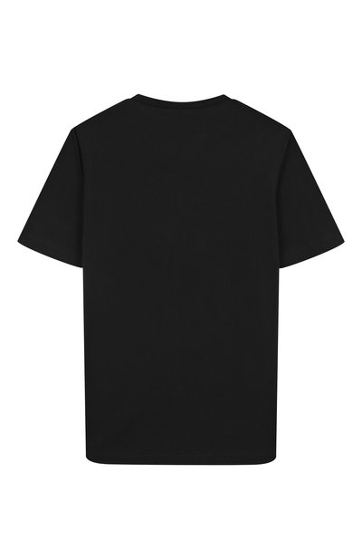 Контрастный логотип на футболке с круглой горловиной дополнили вышивкой перламутровыми бусинами. Для изготовления модели использовали хлопковое джерси.