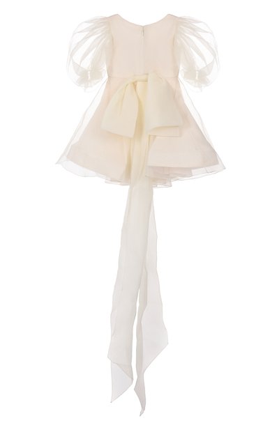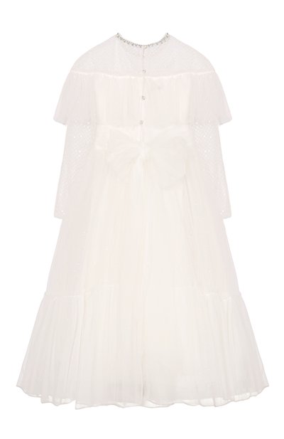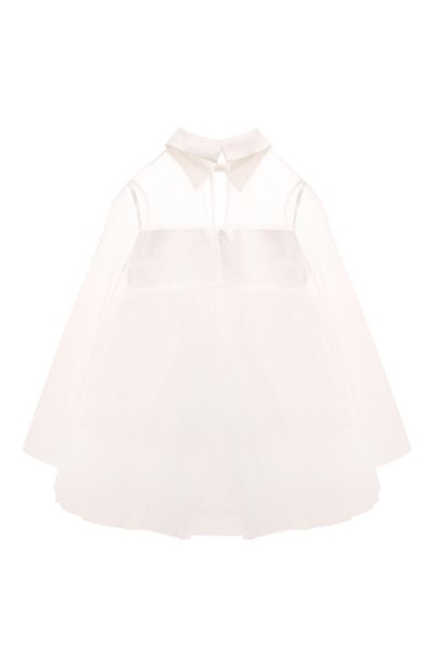Платье с пышным подолом-баллоном из шелковистого твила выполнили из ажурного материала на основе хлопка. Модель с кружевным воротником-стойкой, представленная эксклюзивно в ЦУМе, застегивается потайной молнией на спинке.