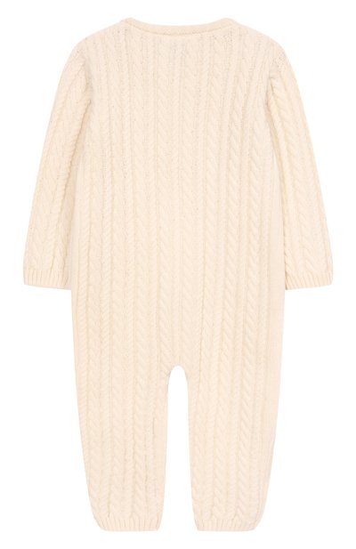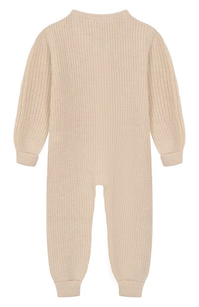 Комбинезон с рельефными узорами-косами связали из шерстяной пряжи. Модель с круглой горловиной и манжетами в рубчик застегивается молнией с брендированным пуллером.