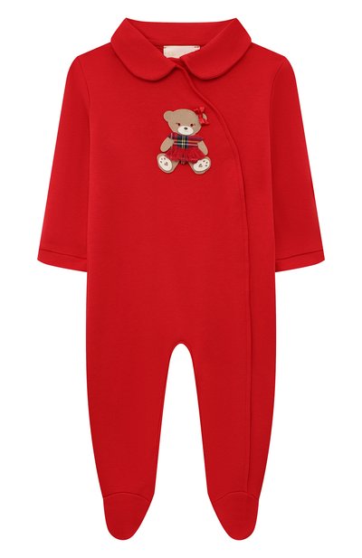 Комбинезон с фестончатой горловиной и эластичными манжетами связали гладью из микса шерсти и кашемира. Модель с жаккардовым изображением медвежонка застегивается 11 пуговицами, идущими вдоль левого регланного шва к низу левой брючины.