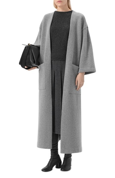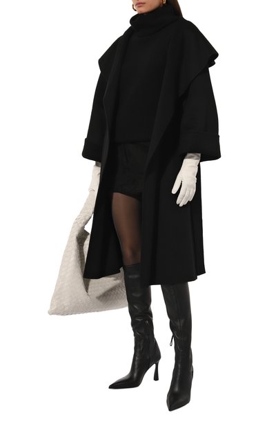 Пальто с широкими заостренными лацканами и боковыми накладными карманами дополнили съемным поясом. Модель изготовили из плотного ворсового кашемира.