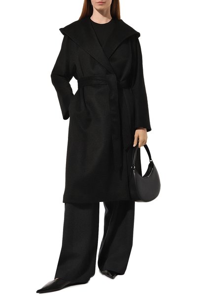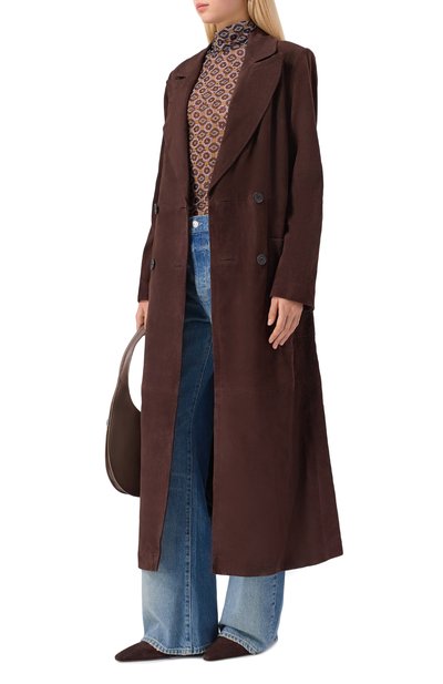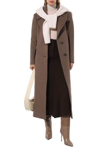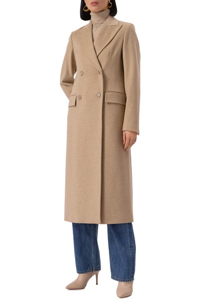 Двубортное пальто с заостренными лацканами выполнили из шерстяного драпа. Модель с парными вытачками на талии и шлицей сзади дополнили двумя карманами с клапанами.