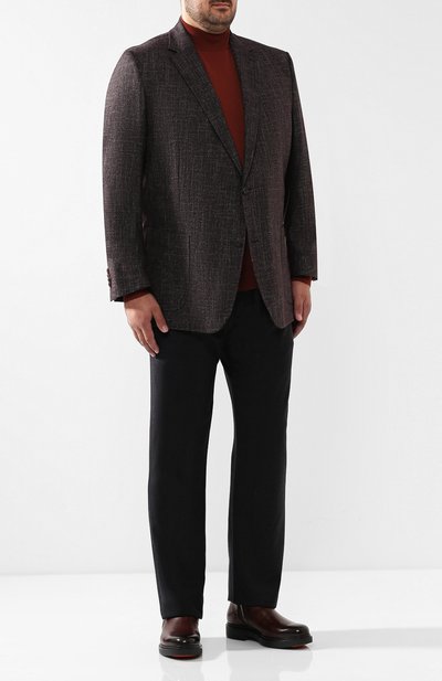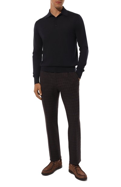 Брюки в меловую полоску выполнили из микса кашемира и нейлона с добавлением шерсти. Изделие с эластичным поясом дополнили задним и двумя боковыми карманами.