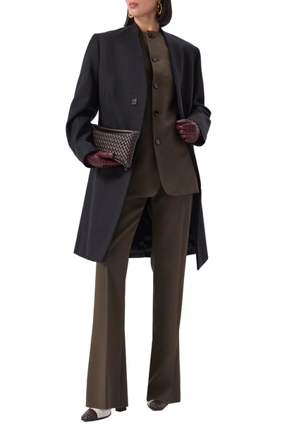 Однобортный жакет с отделкой из гладкой кожи ягненка выполнили из флиса на основе шерсти первого пострига с добавлением кашемира. Модель с фигурным вырезом и спущенной линией плеч дополнили парой накладных карманов.