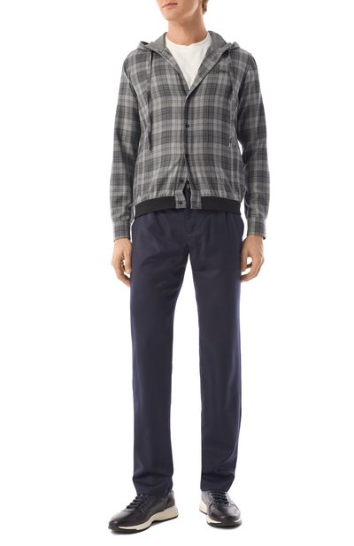 Широкие брюки с зауженным низом и эластичной вставкой на поясе сзади дополнили четырьмя карманами. Для изготовления модели использовали шерстяную фланель.