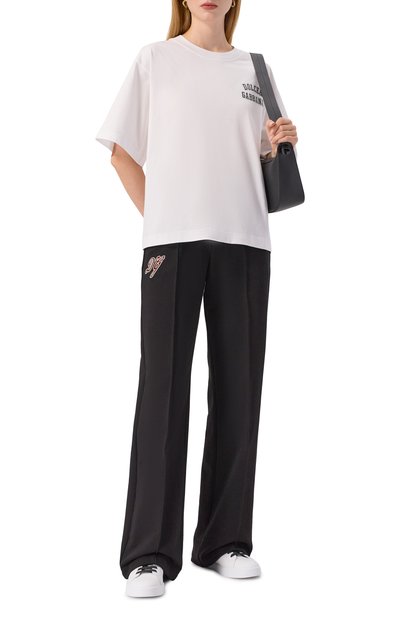 Зауженные брюки с отстроченными стрелками сшиты из эластичной смеси полиэстера, вискозы и шерсти. Модель с широким поясом-кулиской дополнена двумя боковыми карманами на молниях.